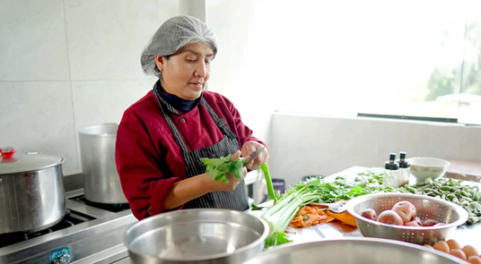 Mitarbeitende erhalten ein kostenloses, warmes Mittagessen in einer Betriebskantine, die von Señora Monica geleitet wird.