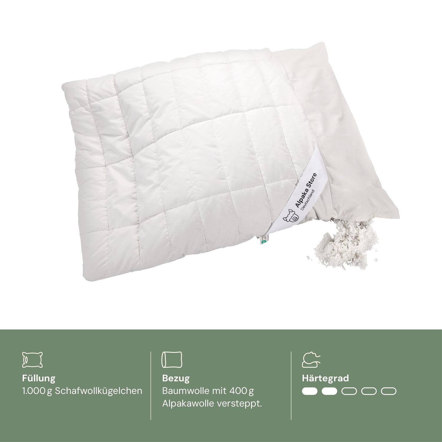 Für den ruhigen und gesunden Schlaf: Kuschelig weiches mit Alpakawolle verstepptes Kopfkissen, welches noch zusätzlich stützt. Gefüllt mit Schafwollkügelchen zur Stabilisierung des Kissens.