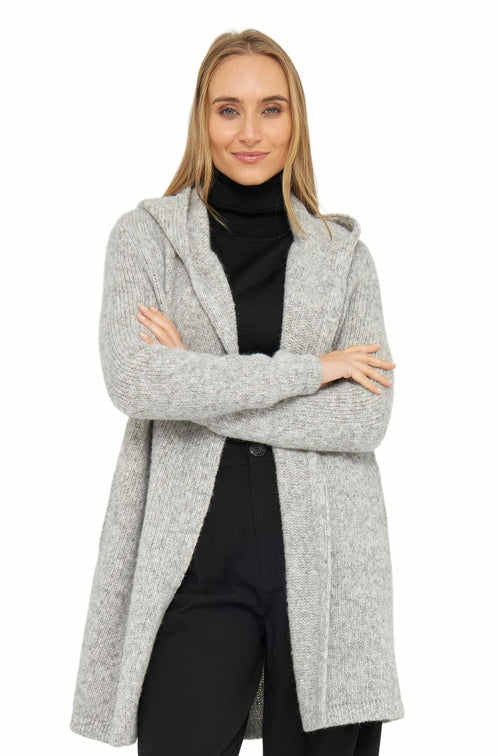 Dieser Alpaka-Long-Cardigan bietet ein flauschiges Trageerlebnis mit einem lässigen, jedoch wohlfühlenden Look. Der fließend fallende Schalkragen, der weite Oversize-Schnitt und die großzügige Kapuze verleihen der Strickjacke eine besondere Note.