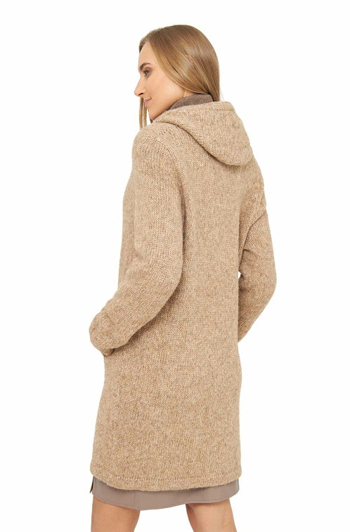 Dieser Alpaka-Long-Cardigan bietet ein flauschiges Trageerlebnis mit einem lässigen, jedoch wohlfühlenden Look. Der fließend fallende Schalkragen, der weite Oversize-Schnitt und die großzügige Kapuze verleihen der Strickjacke eine besondere Note.